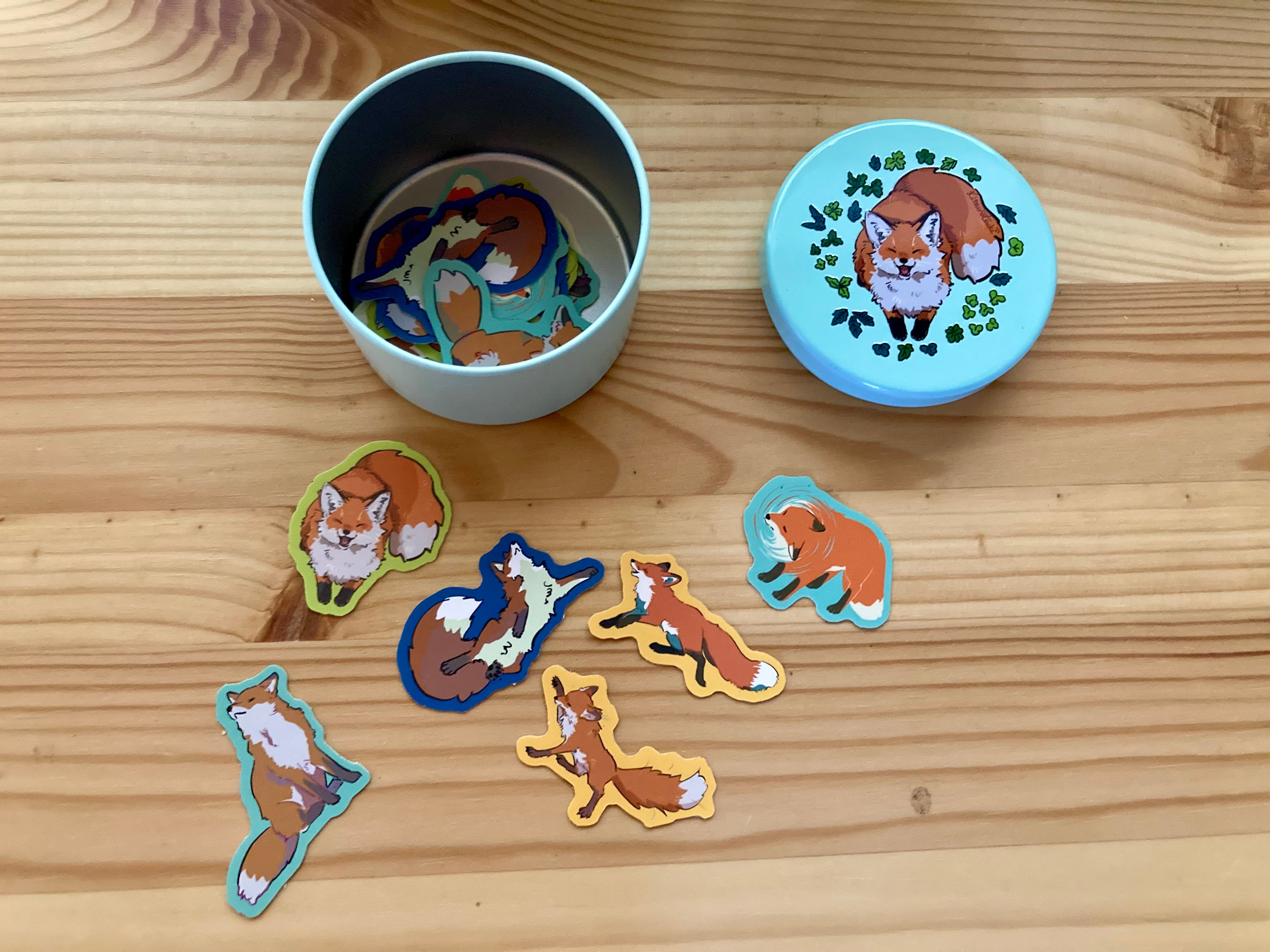 キツネのフレークシールが入ったシール缶です。10種類✕2枚入り。シールサイズは4✕4cm。缶のサイズは直径65mm×高さ50mm。