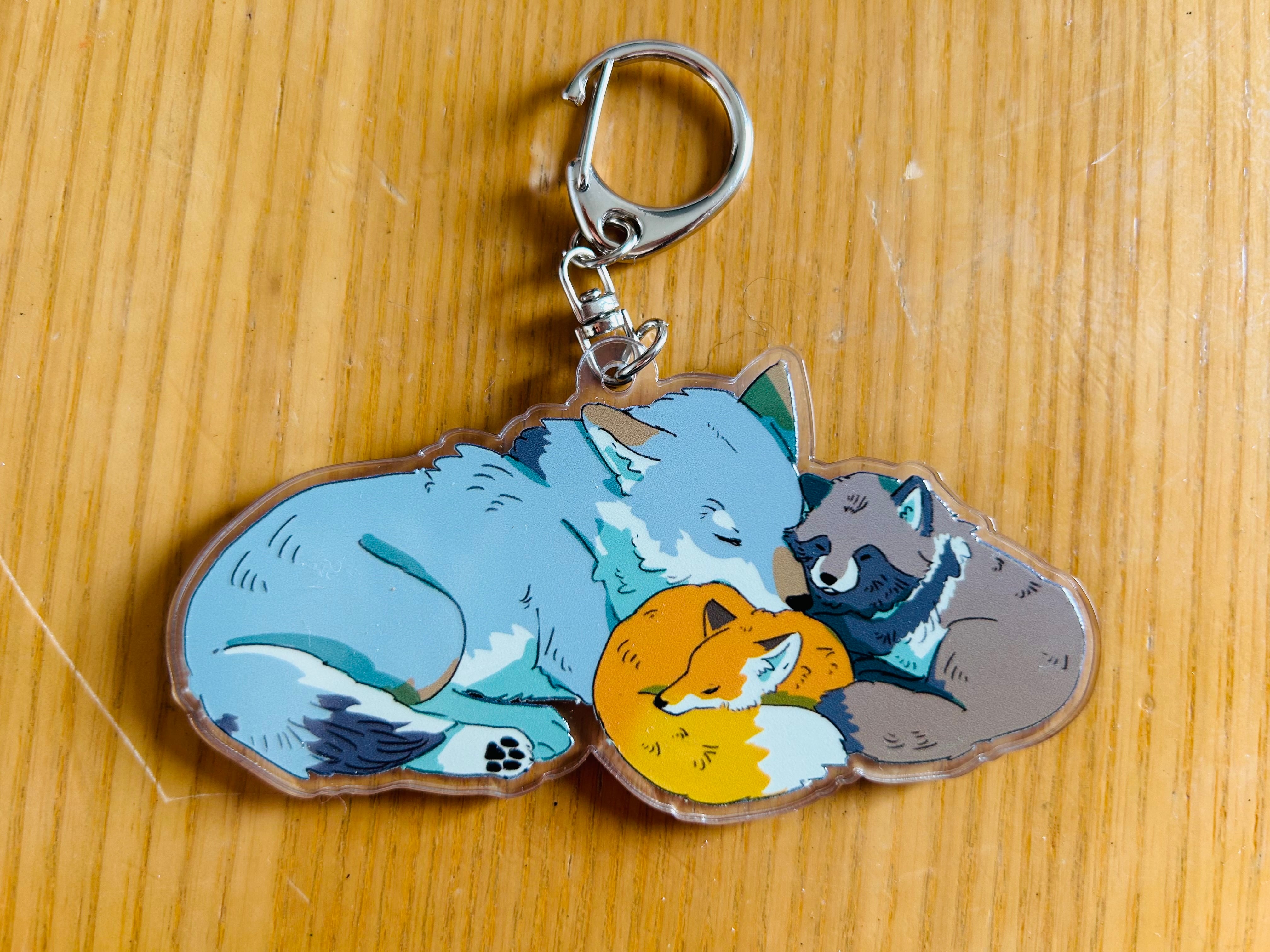 眠るイヌ科たち(キツネとタヌキとオオカミ)の大きめのアクキーです。サイズは横約10cm、縦約5cmです。両面印刷です。